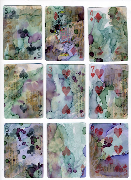 Today, I decided to make some decorated playing cards to use as journaling cards. I used some alcohol ink splattered vellum to give them a bit of a twist. These were fun and I will definitely do more in the future. They are backed with hand-dyed paper to create a writing surface. Here's the group.